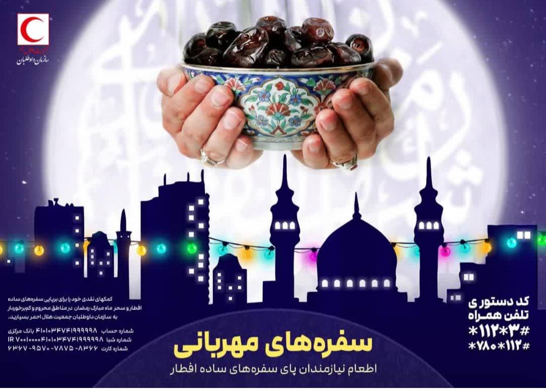 کمکهای نقدی خود را برای برپایی سفرههای ساده افطار و سحر ماه مبارک رمضان در مناطق محروم و کم برخوردار به سازمان داوطلبان جمعیت هلالاحمر بسپارید.