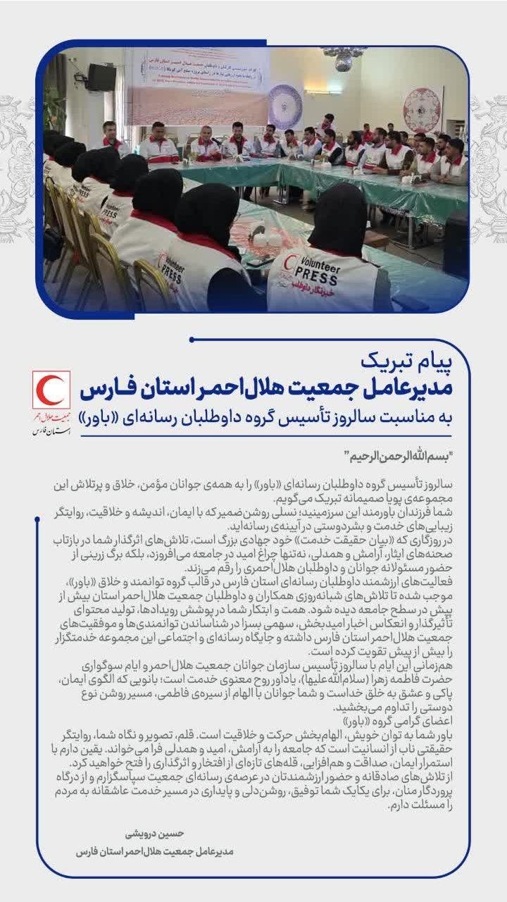 پیام تبریک مدیرعامل جمعیت هلالاحمر استان فارس به مناسبت سالروز تأسیس گروه داوطلبان رسانهای «باور»