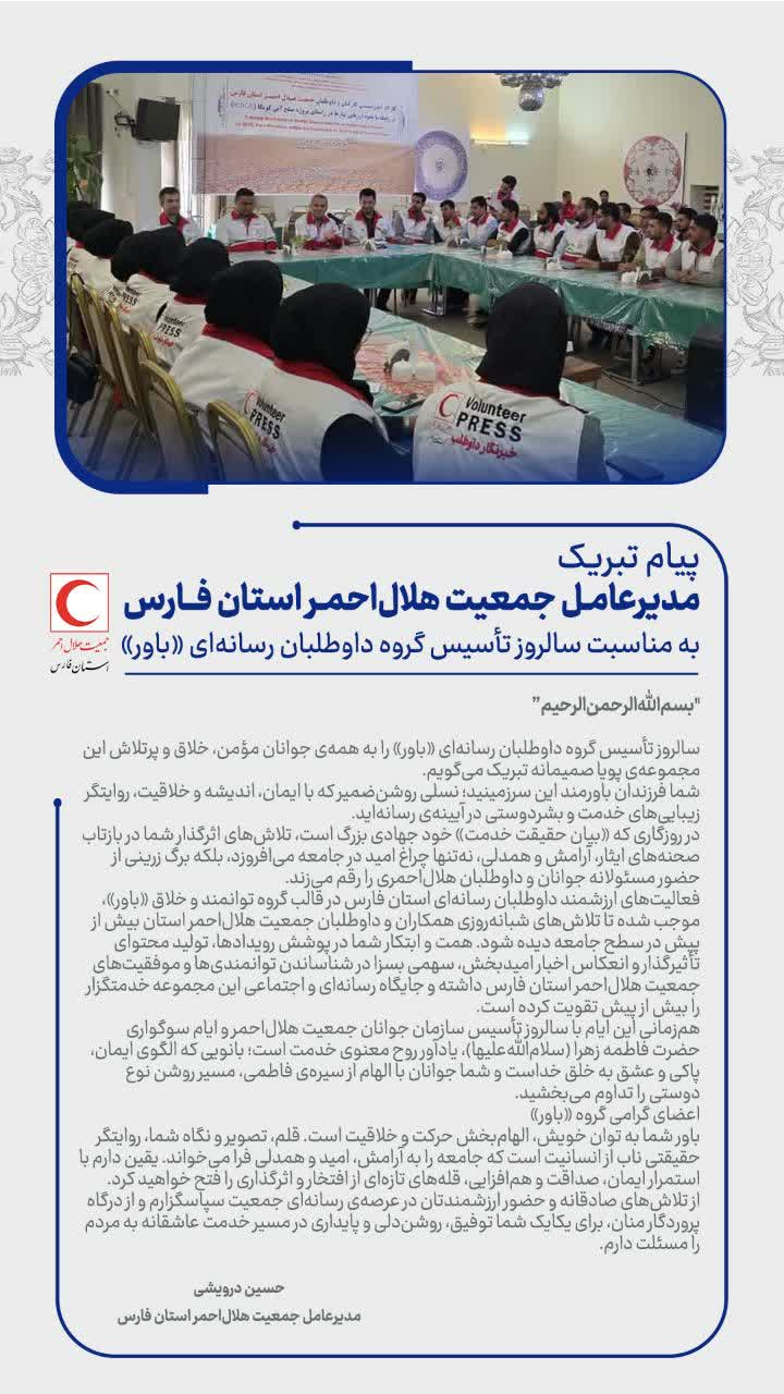 فعالیتهای ارزشمند داوطلبان رسانهای استان فارس در قالب گروه توانمند و خلاق «باور»، موجب شده تا تلاشهای شبانهروزی همکاران و داوطلبان جمعیت هلالاحمر استان بیش از پیش در سطح جامعه دیده شود. همت و ابتکار شما در پوشش رویدادها، تولید محتوای تأثیرگذار و انعکاس اخبار امیدبخش، سهمیبسزا در شناساندن توانمندیها و موفقیتهای جمعیت هلالاحمر استان فارس داشته و جایگاه رسانهای و اجتماعی این مجموعه خدمتگزار را بیش از پیش تقویت کرده است.
